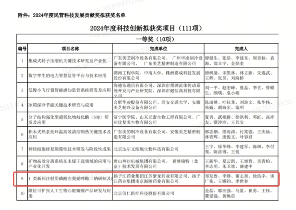 中國民營(yíng)科技促進(jìn)會(huì )(國家民政部和國家科學(xué)技術(shù)部直管單位)公布"2024年度中國民營(yíng)科技發(fā)展貢獻獎"評審結果。此次由江蘇紫龍藥業(yè)有限公司、南京海陵藥業(yè)有限公司、南京研究院以"產(chǎn)研結合方式"三方聯(lián)合申報,憑借自主研發(fā)的化學(xué)1類(lèi)新藥一"注射用磷酸左奧硝唑酯二鈉"(簡(jiǎn)稱(chēng)-商品名:新銳)的首創(chuàng )綠色工藝和較好的臨床治療價(jià)值,榮膺一等獎。本年度貢獻獎共評出科技創(chuàng )新獎111項(一等獎10項,二等獎38項,三等獎63項),"新銳"是唯一一項化學(xué)藥榮獲一等獎的醫藥項目,這一榮譽(yù)對集團創(chuàng )新藥研發(fā)戰略具有里程碑式的意義。該獎項不僅是對"新銳"在綠色工藝突破與臨床價(jià)值方面的高度認可,更彰顯了企業(yè)在化學(xué)藥領(lǐng)域自主創(chuàng )新的硬核實(shí)力。